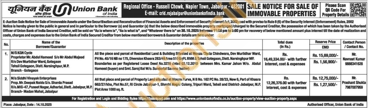 2) All that piece and parcel of Property Land situated at Mouza Purva, NB No. 162 PC No. 28/33, Now 6, Part of Khasra 662/27/kha, Plot No.57, RI Circle Jabalpur-1, Shastri Nagar Colony, Tripuri Ward, Tehsil and District-Jabalpur, M.P. Plot Area 1000 sq. ft