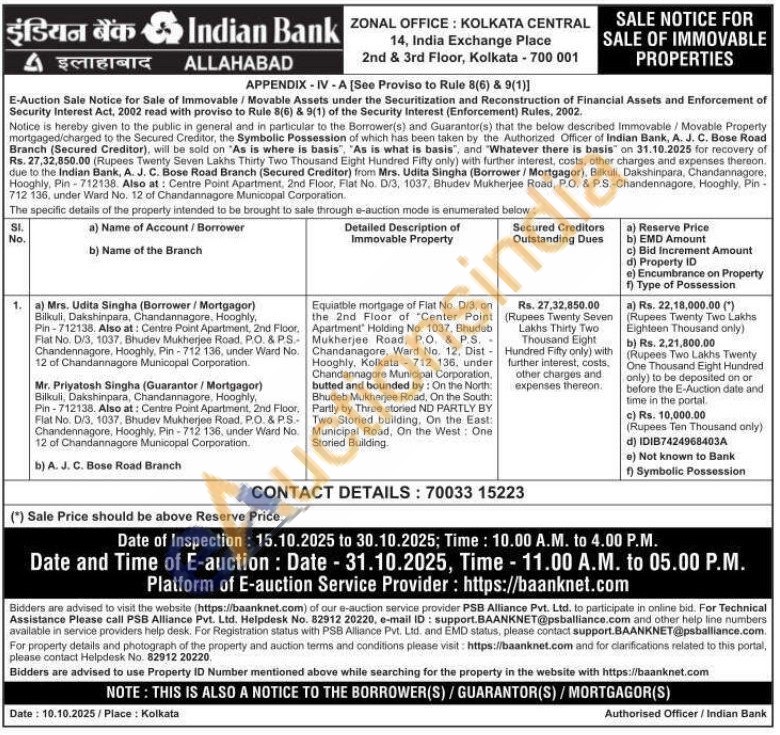 Equiatble mortgage of Flat No. D/3, on the 2nd Floor of "Center Point Apartment Holding No. 1037, Bhudeb Mukherjee Road, P.O. & P.S. Chandanagore, Ward No. 12. Dist Hooghly, Kolkata 712 136, under Chandannagore Municipal Corporation, butted and bounded by: On the North: Bhudeb Mukherjee Road, On the South: Partly by Three storied ND PARTLY BY Two Storied building, On the East: Municipal Road, On the West: One Storied Building