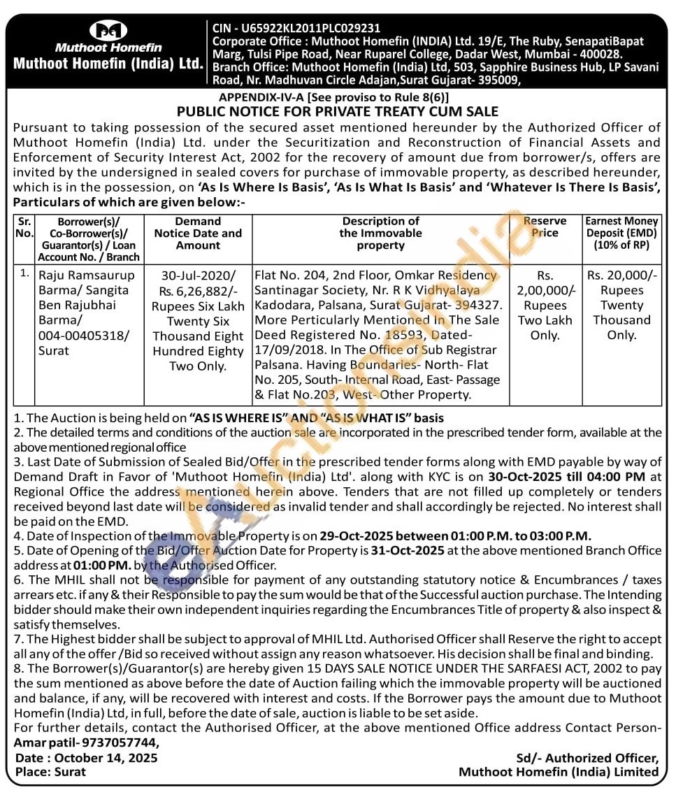 Flat No. 204, 2nd Floor, Omkar Residency Santinagar Society, Nr. R K Vidhyalaya Kadodara, Palsana, Surat Gujarat- 394327. More Perticularly Mentioned In The Sale Deed Registered No. 18593, Dated-17/09/2018. In The Office of Sub Registrar Palsana. Having Boundaries- North- Flat No. 205, South- Internal Road, East- Passage & Flat No.203, West- Other Property.