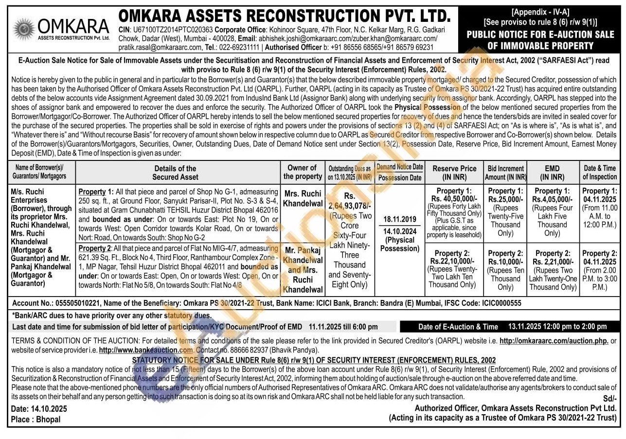 Property 2: All that piece and parcel of Flat No MIG-4/7, admeasuring 621.39 Sq. Ft., Block No 4, Third Floor, Ranthambour Complex Zone -1, MP Nagar, Tehsil Huzur District Bhopal 462011 and bounded as under: On or towards East: Open, On or towards West: Open, On or towards North: Flat No 5/8, On towards South: Flat No 4/8