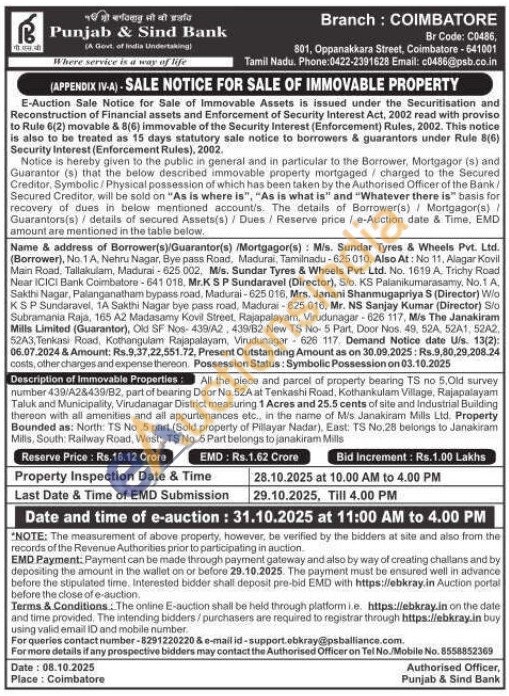 All the piece and parcel of property bearing TS no 5,Old survey number 439/A24439/82, part of bearing Door No.524 at Tenkashi Road, Kothankulam Village, Rajapalayam Taluk and Municipality, Virudanagar District measuring 1 Acres and 25.5 cents of site and Industrial Building thereon with all amenities and all appurtenances etc., in the name of Mis Janakiram Mills Ltd. Property Bounded as: North: TS No 5 part (Sold property of Pillayar Nadar), East: TS No.28 belongs to Janakiram Milis, South: Railway Road, West: TS No. 5 Part belongs to janakiram Mills