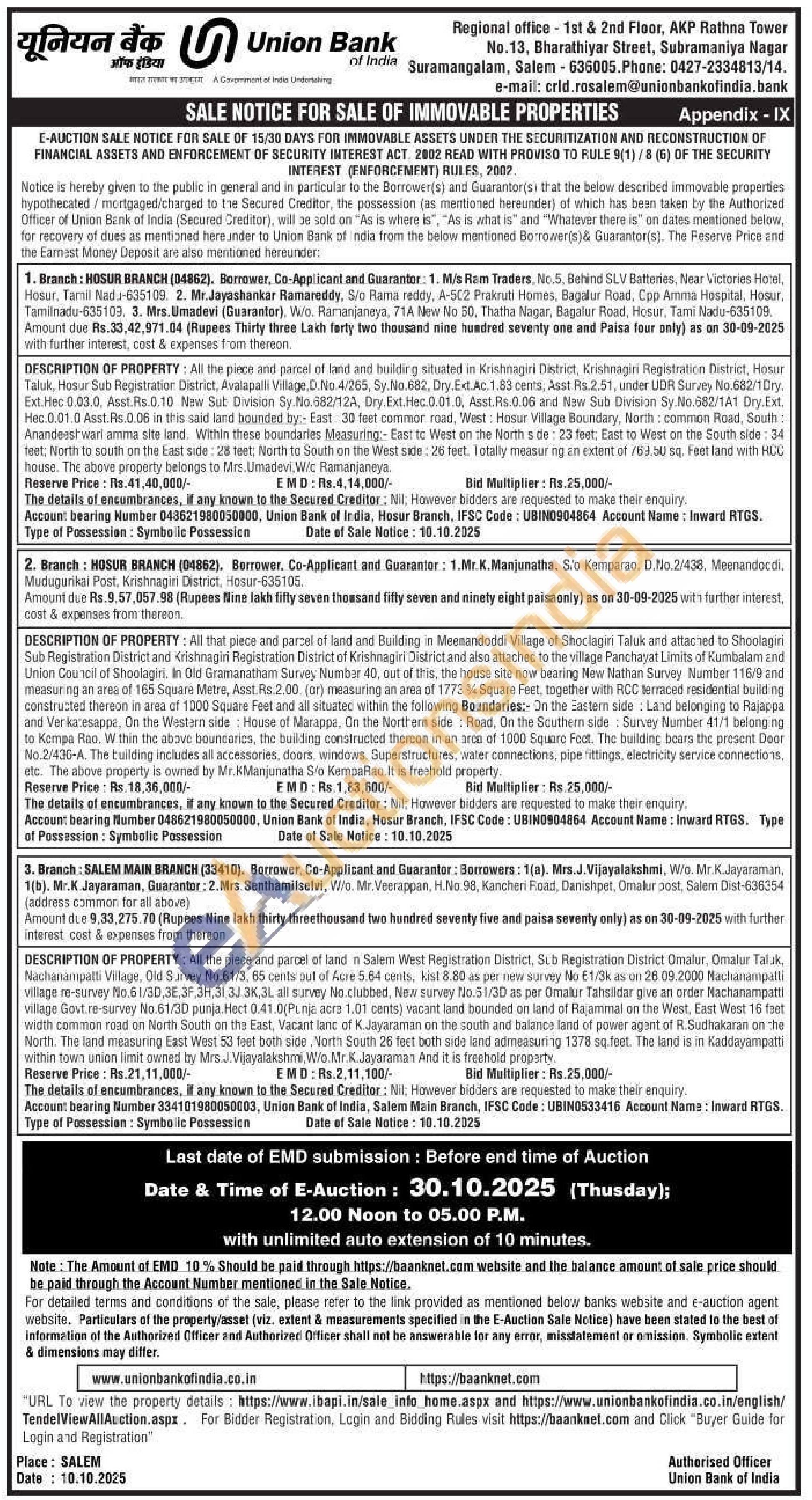 DESCRIPTION OF PROPERTY: All the piece and parcel of land in Salem West Registration District, Sub Registration District Omalur, Omalur Taluk, Nachanampatti Village, Old Survey No.61/3, 65 cents out of Acre 5.64 cents, kist 8.80 as per new survey No 61/3k as on 26.09.2000 Nachanampatti village re-survey No.61/3D, 3E,3F,3H,31,3J,3K,3L all survey No.clubbed, New survey No.61/3D as per Omalur Tahsildar give an order Nachanampatti village Govt.re-survey No.61/3D punja. Hect 0.41.0(Punja acre 1.01 cents) vacant land bounded on land of Rajammal on the West, East West 16 feet width common road on North South on the East, Vacant land of K.Jayaraman on the south and balance land of power agent of R. Sudhakaran on the North. The land measuring East West 53 feet both side, North South 26 feet both side land admeasuring 1378 sq.feet. The land is in Kaddayampatti within town union limit owned by Mrs.J.Vijayalakshmi, W/o.Mr.K.Jayaraman And it is freehold property.