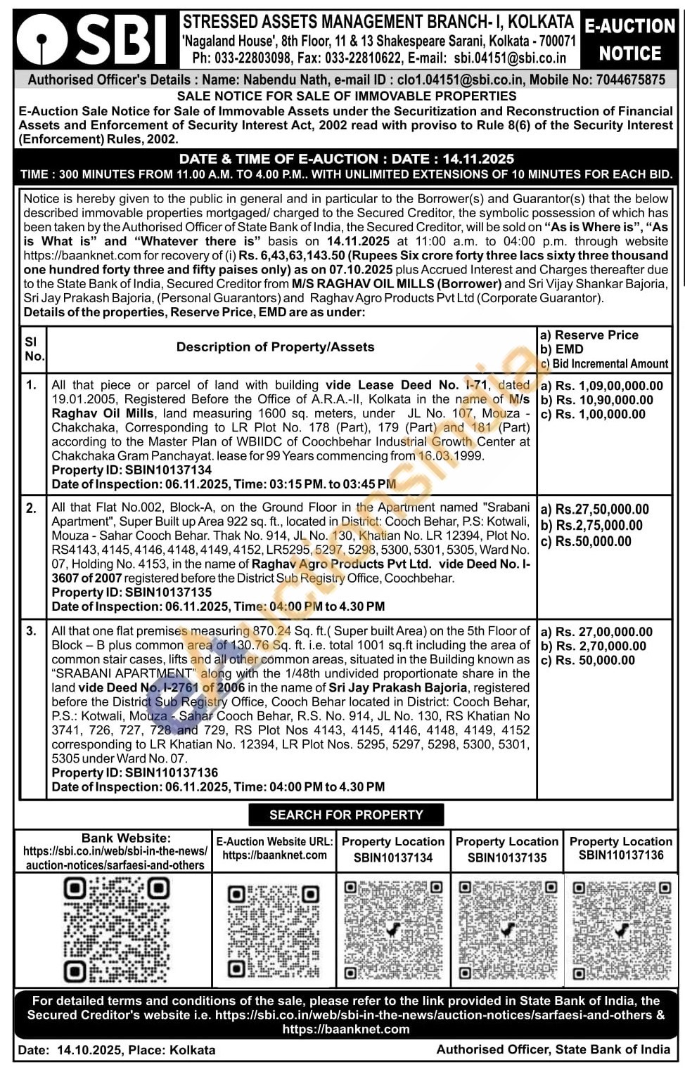 2. All that Flat No.002, Block-A, on the Ground Floor in the Apartment named "Srabani Apartment", Super Built up Area 922 sq. ft., located in District: Cooch Behar, P.S: Kotwali, Mouza - Sahar Cooch Behar. Thak No. 914, JL No. 130, Khatian No. LR 12394, Plot No. RS4143,4145, 4146, 4148, 4149, 4152, LR5295, 5297, 5298, 5300, 5301, 5305, Ward No. 07, Holding No. 4153, in the name of Raghav Agro Products Pvt Ltd. vide Deed No. I-3607 of 2007 registered before the District Sub Registry Office, Coochbehar.