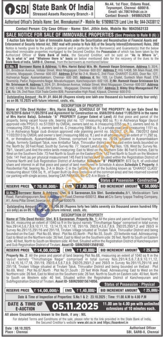 DESCRIPTION OF PROPERTY : Name of Title Deed Holder: Mrs. Harini Balaji, SCHEDULE OF THE PROPERTY: As per Sale Deed No 6570/2016 dated 11/05/2016 and Agreement for Construction no. 6569/2016 dated 11/05/2016 in the name of Mrs Harini Balaji. Schedule "A" PROPERTY (Larger Extent of Land) All that piece and parcel of the property, being vacant house site, bearing plot no. 127 (measuring 900 sq. ft.) in Aishwarya Nagar (layout approved vide PPD/LO. no.57/2001 by CMDA), owners land no. A (measuring 2255 sq. ft.), owners land no. B (measuring 2352 sq. ft.), owners land no. C (measuring 3968 sq. ft.) a private road area (measuring 1151 sq. ft.) in Aishwarya Nagar (sub division approved vide planning permit no. 53/2012, LR. No. 736/2012 dated 11/02/2013 by CMDA) and owner's land (measuring 666 sq. ft.) and in all admeasuring an extent of 11,292 sq. ft., or thereabouts, Ayanambakkam, Chennai, comprised in survey no. 79/2B, situated in Ayanambakkam village, formerly Saidapet Taluk, now Ambattur Taluk, Thiruvallur district and the said entire lands bounded on the: North by: 30 Feet Road, South by: Survey No. 77, Vacant Land, East by: Plot Nos. 126, West by: Survey No. 79/1, Vacant Land And the entire lands measuring: East to West on the Northern Side: 86 Feet 6 Inches, East to West on the Southern Side: 73 Feet North to South on the Eastern Side: 142 Feet North to South on the Western Side: 141 Feet (as per physical measurement 145 Feet 9 Inches) And situated within the Registration District of Chennai North and Sub Registration District of Ambattur. Schedule "B" PROPERTY: 873 Sq.ft, of undivided share and interest in all that piece and parcel of land mentioned in Schedule A above.Schedule C Property: A Residential Flat, bearing No. 2-A in Block-C in the Second Floor of the building known as 'CHARIOT CLASS measuring about 1356 Sq. ft., of Super Built Up Area (inclusive of the common area) and two reserved covered car parking with single access, bearing CAR PARKING No. C/2-A in Block-C