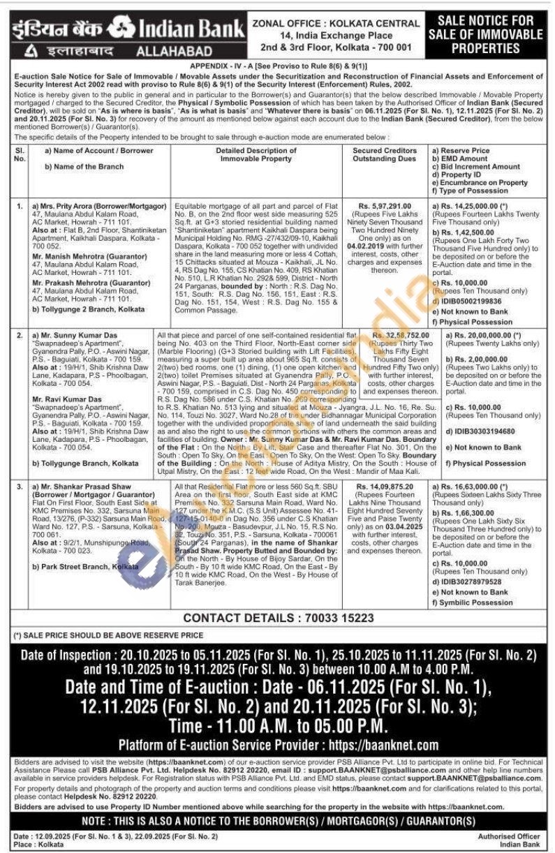 All that Residential Flat more or less 560 Sq ft. SBU Area on the first floor, South East side at KMC Premises No. 332 Sarsuna Main Road, Ward No. 127 under the K.M.C. (S.S Unit) Assessee No. 41-127-15-0140-0 in Dag No. 356 under C.S Khatian No. 200, Mouza-Basudevpur, J.L No. 15. R.S No. 82. Touzi No. 351, P.S.Sarsuna, Kolkata-700061 (South 24 Parganas), in the name of Shankar Prasad Shaw. Property Butted and Bounded by: On the North By House of Bijoy Sardar, On the South-By 10 ft wide KMC Road, On the East -By 10. ft wide KMC Road, On the West - By House of Tarak Banerjee.