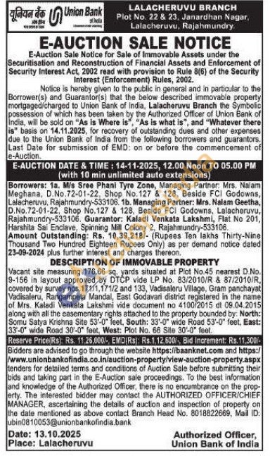 Vacant site measuring 176.66 sq. yards situated at Plot No.45 nearest D.No. 9-156 in layout approved by DTCP vide LP No. 83/2010/R & 87/2010/R, covered by survey nos. 171/1,171/2 and 133, Vadisaleru Village, Gram panchayat Vadisaleru, Rangampela Mandal, East Godavari district registered in the name of Mrs. Kaladi Venkata Lakshmi vide document no 4100/2015 dt 09.04.2015 along with all the easementary rights attached to the property bounded by: North: Somu Satya Krishna Site 53-0" feet, South: 33-0" wide Road 53-0" feet, East: 33-0" wide Road 30-0" feet, West: Plot No. 66 Site 30-0 feet.