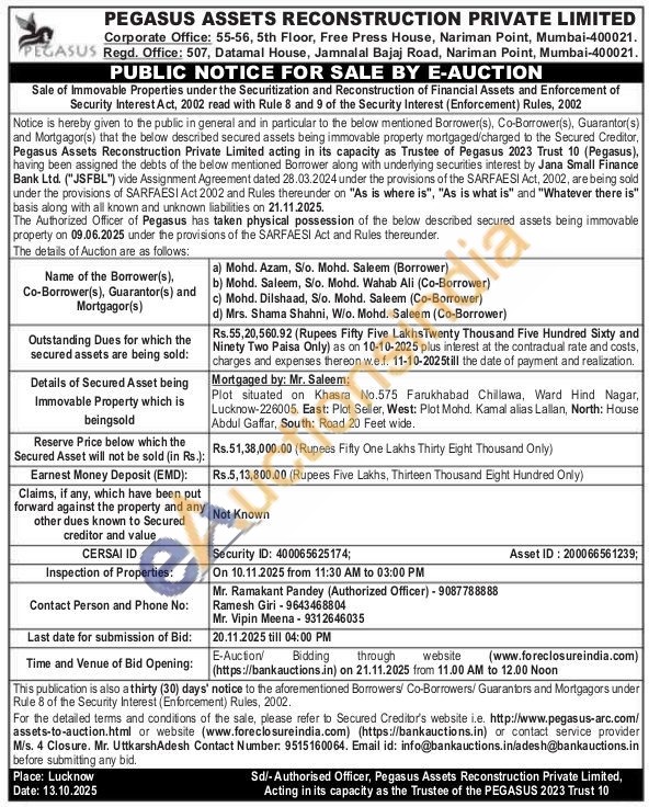 Mortgaged by: Mr. Saleem: Plot situated on Khasra No.575 Farukhabad Chillawa, Ward Hind Nagar, Lucknow-226005. East: Plot Seller, West: Plot Mohd. Kamal alias Lallan, North: House Abdul Gaffar, South: Road 20 Feet wide