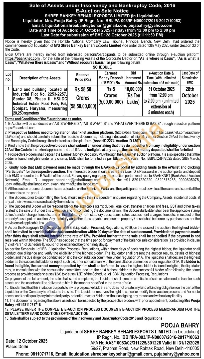 Land and building located at Industrial Plot No. 2253-2257, Sector 38, Phase II, HSIIDC Industrial Estate, Food Park, Rai, Sonipat, Haryana, measuring 20,250 sq meters