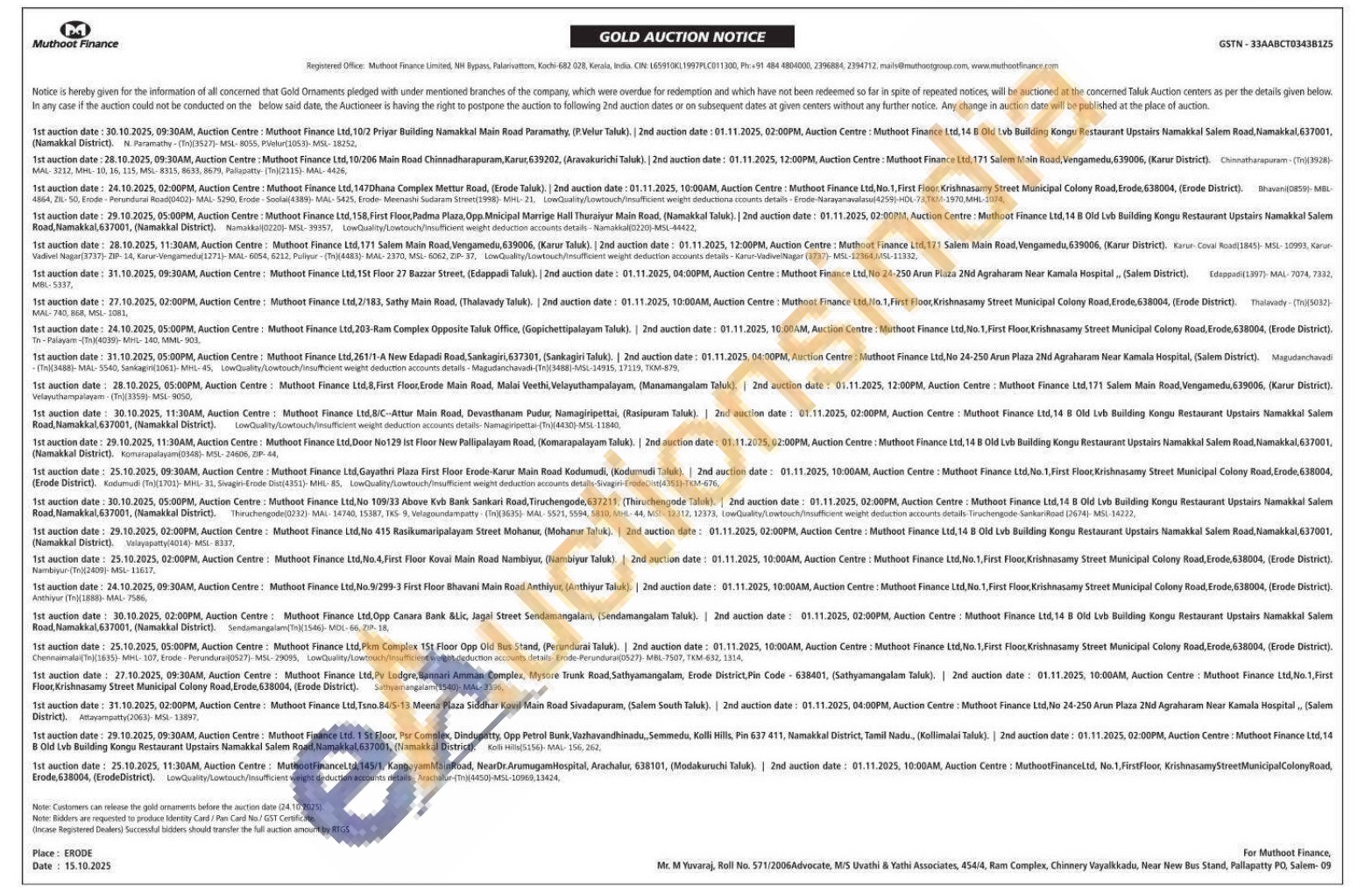 Muthoot Finance Ltd Gold Auctions Auction in Namakkal