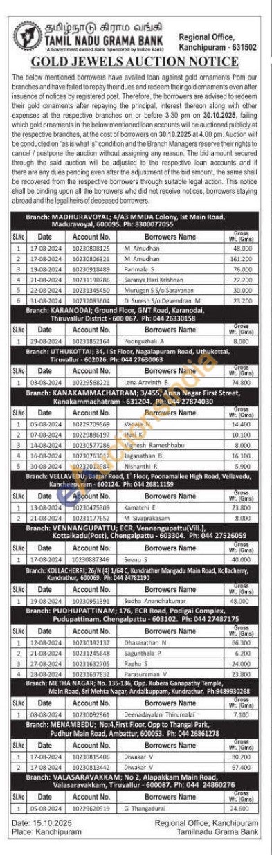 Tamil Nadu Grama Bank Gold Auctions Auction in Kanchipuram