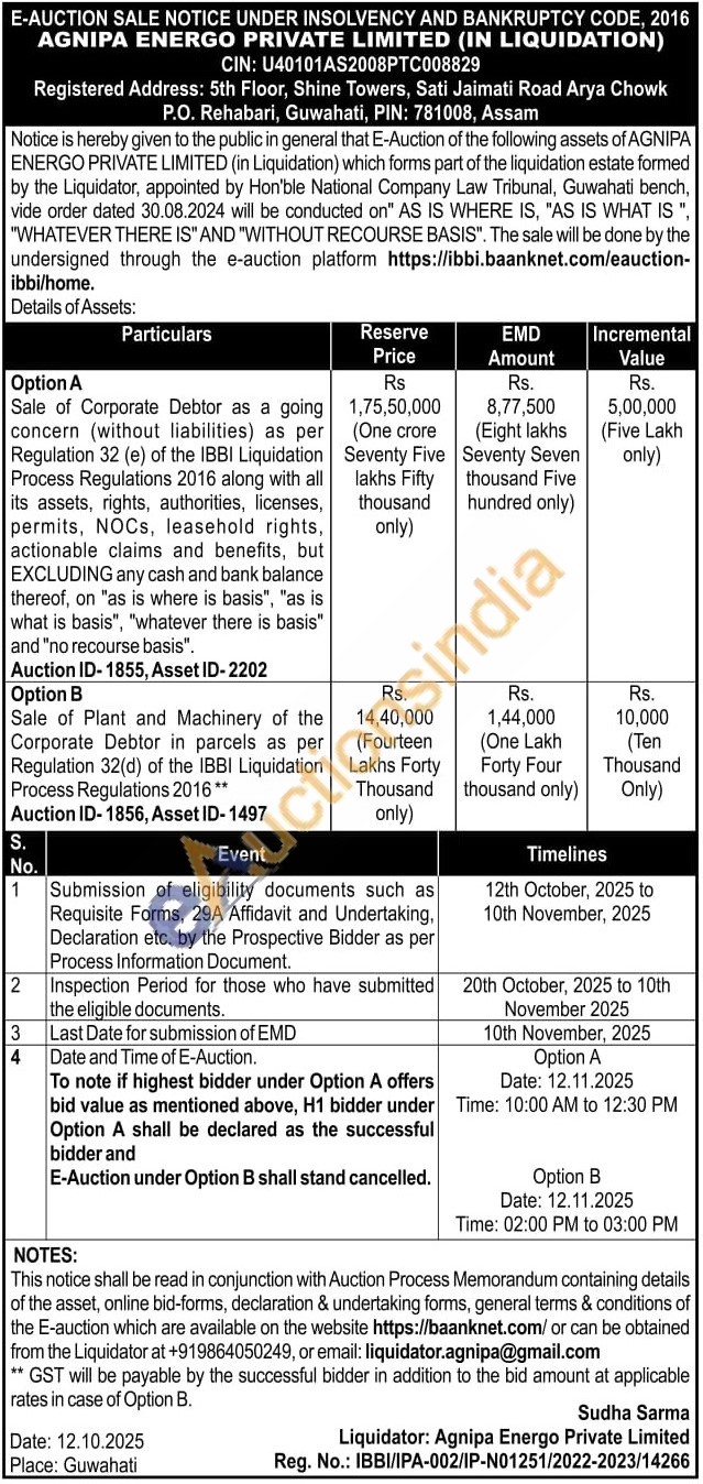 Option A : Sale of Corporate Debtor as a going concern (without liabilities) as per Regulation 32 (e) of the IBBI Liquidation Process Regulations 2016 along with all its assets, rights, authorities, licenses, permits, NOCs, leasehold rights, actionable claims and benefits, but EXCLUDING any cash and bank balance thereof, on "as is where is basis", "as is what is basis", "whatever there is basis" and "no recourse basis"