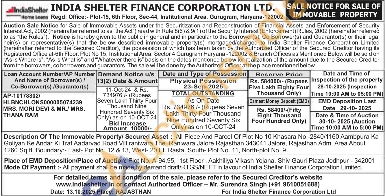 Description Of The Immovable Property/ Secured Asset: All Piece And Parcel Of Plot No 10 Khasara No -2840/1160 Aambpura Ka Goliyan Ke Andar Ki Traf Aadarvad Road Vill.raniwara The. Raniwara Jalore Rajasthan 343041 Jalore, Rajasthan Adm. Area About 1260 Sq.ft. Boundary:- East- Pot No. 12 & 13, West- 20 Ft. Rasta, South- Plot No. 11, North-plot No. 9