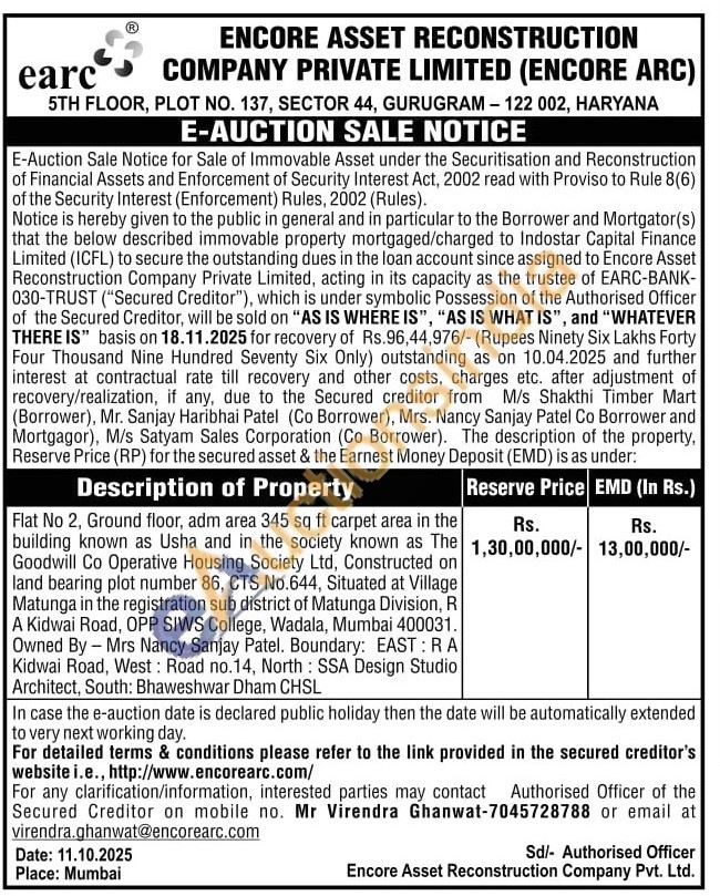 Flat No 2, Ground floor, adm area 345 sq ft carpet area in the building known as Usha and in the society known as The Goodwill Co Operative Housing Society Ltd, Constructed on land bearing plot number 86, CTS No.644, Situated at Village Matunga in the registration sub district of Matunga Division, R A Kidwai Road, OPP SIWS College, Wadala, Mumbai 400031. Owned By - Mrs Nancy Sanjay Patel. Boundary: EAST: RA Kidwai Road, West: Road no.14, North: SSA Design Studio Architect, South: Bhaweshwar Dham CHSL