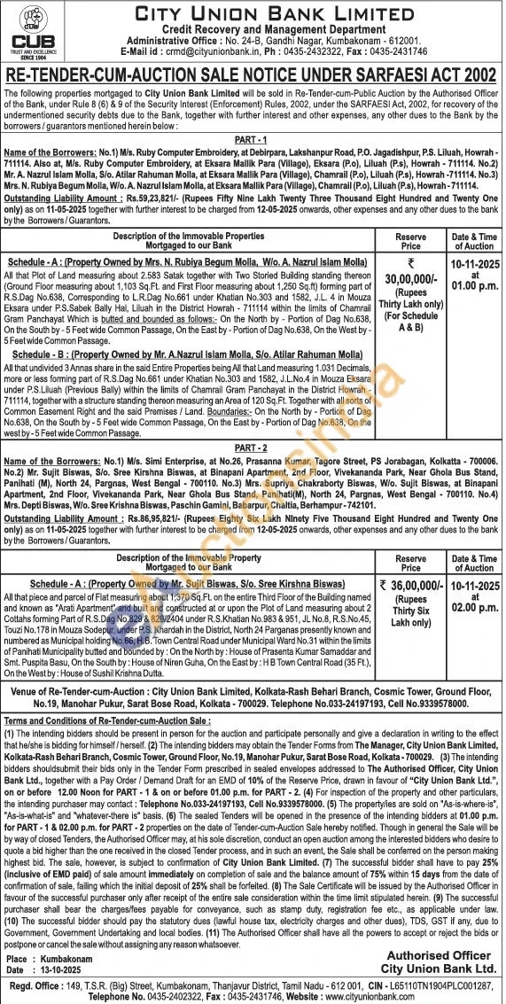 All that Plot of Land measuring about 2.583 Satak together with Two Storied Bulding standing thereon (Ground Floor measuring about 1,103 Sq Ft. and First Floor measuring about 1,250 Soft) forming part of R.5.Dag No.638, Corresponding to LR.Dag No.661 under Khatian No.303 and 1582, JL. 4 in Mouza Eksara under P.S.Sabek Bally Hal, Lilluah in the District Howrah-711114 within the limits of Chamnal Gram Panchayat Which is butted and bounded as follows On the North by Portion of Dag No:638, On the South by-5 Feet wide Common Passage, On the East by-Portion of Dag No.538. On the West by 5 Feet wide Common Passage All that undivided 3 Annas share in the said Entire Properties being All that Land measuring 1.031 Decimals, more or less forming part of R.S.Dag No.661 under Khatian No.303 and 1582, J.L.No.4 in Mouza Eksara under P.S.Liluah (Previous Bally) within the limits of Chamrail Gram Panchayat in the District Howrah-711114, Iogether with a structure standing thereon measuring an Area of 120 Sq. Ft. Together with all sorts of Common Easement Right and the said Premises/Land. Boundaries: On the North by-Portion of Dag No 638, On the South by-5 Feet wide Common Passage, On the East by-Portion of Dag No.638, On the westby-5 Feet wide Common Passage.