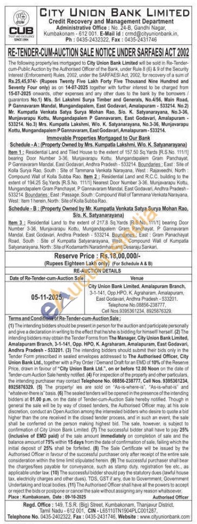 Item 1: Residential Land and Tiled House to the extent of 157.50 Sq. Yards [R.S.No. 111/1] bearing Door Number 3-36, Munjavarapu Kottu Mungandapalem Gram Panchayat, P Gannavaram Mandal, East Godavari, Andhra Pradesh-533214. Boundaries: East: Site of Kolla Surya Rao, South Site of Tammana Venkata Narayana, West: Rajaveechi, North: Compound Wall of Kolla Subba Rao. Item 2: Residential Land and R.C.C. building to the extent of 194.25 Sq. Yards [R.S.No. 111/1] Nearest Door Number 3-36. Munjavarapu Kottu, Mungandapalem Gram Panchayat, P Gannavaram Mandal, East Godavari, Andhra Pradesh-533214. Boundaries: East: Passage, South: Compound Wall of Tammana Venkata Narayana, West: Item 1 herein, North Site of Kolla Subba Rao.