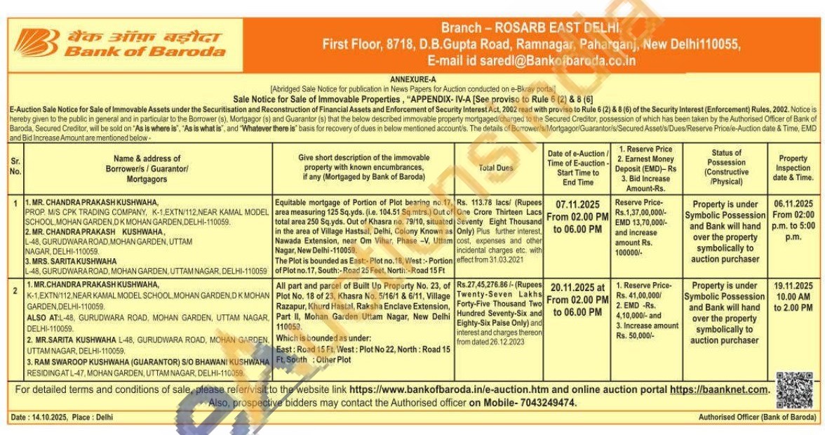 2) All part and parcel of Built Up Property No. 23, of Plot No. 18 of 23, Khasra No. 5/16/1 & 6/11, Village Razapur, Khurd Hastal, Raksha Enclave Extension, Part II, Mohan Garden Uttam Nagar, New Delhi 110059. Which is bounded as under: East: Road 15 Ft, West: Plot No 22, North: Road 15 Ft, South: Other Plot