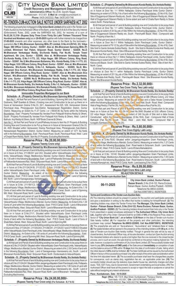 Schedule-A: (Property Owned by M/s. Bhavanam Spinning Mills (P) Limited) : Item No. 1: All that Part and Parcel of Land & Building (Spinning Mill Unit, Machinery Hall, Godowns, Staff Quarters & Others) Existing now and Construction to be put up there on in future at Vemavaram Grama D.No.33, 35/1, Assessment No.525, 526, Vemavaram Grama Panchayat Area, Phirangipuram Sub-District, Narasaraopet Registration District, Guntur District. Measuring an Extent Ac. 11.37 Cents (or) 55030.80 Sq. Yards within the following Boundaries: East: Property Purchased By Vendee From Potlapalli Krishna Reddy & Others, South Property Purchased By Vendee From Potlapalli Koti Reddy & Others, West: Land of Bathula Anji Reddy & Others, North: NSP Bode Channel & Others.