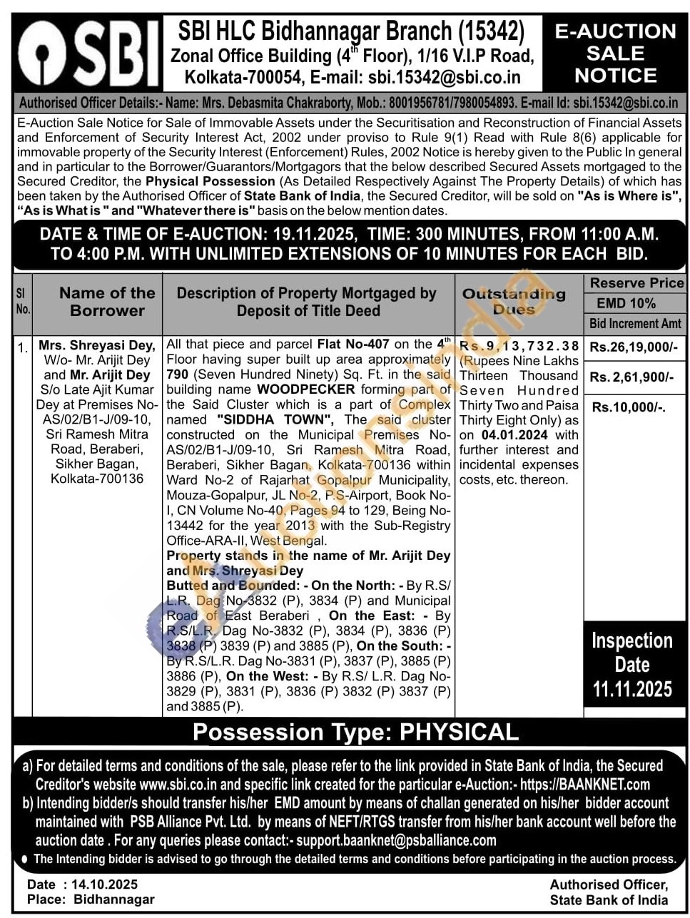 All that piece and parcel Flat No-407 on the 4" Floor having super built up area approximately ( 790 (Seven Hundred Ninety) Sq. Ft. in the said building name WOODPECKER forming part of the Said Cluster which is a part of Complex named "SIDDHA TOWN", The said cluster constructed on the Municipal Premises No-AS/02/B1-J/09-10, Sri Ramesh Mitra Road, Beraberi, Sikher Bagan, Kolkata-700136 within Ward No-2 of Rajarhat Gopalpur Municipality, Mouza-Gopalpur, JL No-2, P.S-Airport, Book No-I, CN Volume No-40, Pages 94 to 129, Being No-13442 for the year 2013 with the Sub-Registry Office-ARA-II, West Bengal.