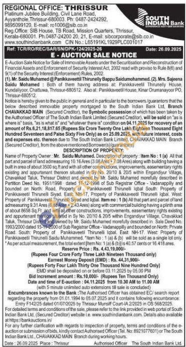 Item No: 1 (a) All that part and parcel of land admeasuring 10.16 Ares (3.08 Ares+ 7.08 Ares) along with building having a built in area of about 3500 sq.ft and with all other constructions, improvements, easementary rights existing and appurtenant thereon situated in Sy No. 20/10 & 2015 within Engandhur Village, Chavakkad Taluk, Thrissur District and owned by Mr. Saidu Muhamed morefully described in Partition Deed No. 1951/1998 dated 17-12-1998 of Sub Registrar Office Vadanappily and bounded on North Road, Property of Panikkaveetil Thirunelli iqbal South: Property of Panikkaveet! Thrunelli Siyad. East: NH-17, Property of Panikkaveet Thirunelli Iqbal West Property of Panikkaveeti Thirunsli Siyad and Iqbal