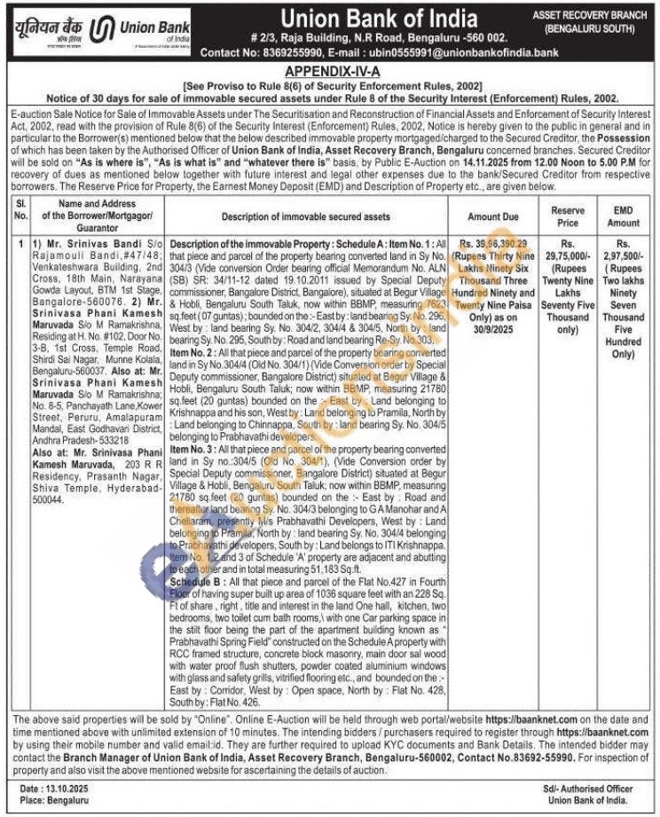 Item No. 1: All that piece and parcel of the property bearing converted land in Sy No. 304/3 (Vide conversion Order bearing official Memorandum No. ALN (SB) SR: 34/11-12 dated 19.10.2011 issued by Special Deputy commissioner, Bangalore District, Bangalore), situated at Begur Village & Hobli, Bengaluru South Taluk, now within BBMP, measuring 7623 sq feet (07 guntas), bounded on the:-East by: land bearing Sy. No. 296, West by land bearing Sy. No. 304/2, 304/4 & 304/5, North by: land bearing Sy. No. 295, South by: Road and land bearing Re-Sy No.303,