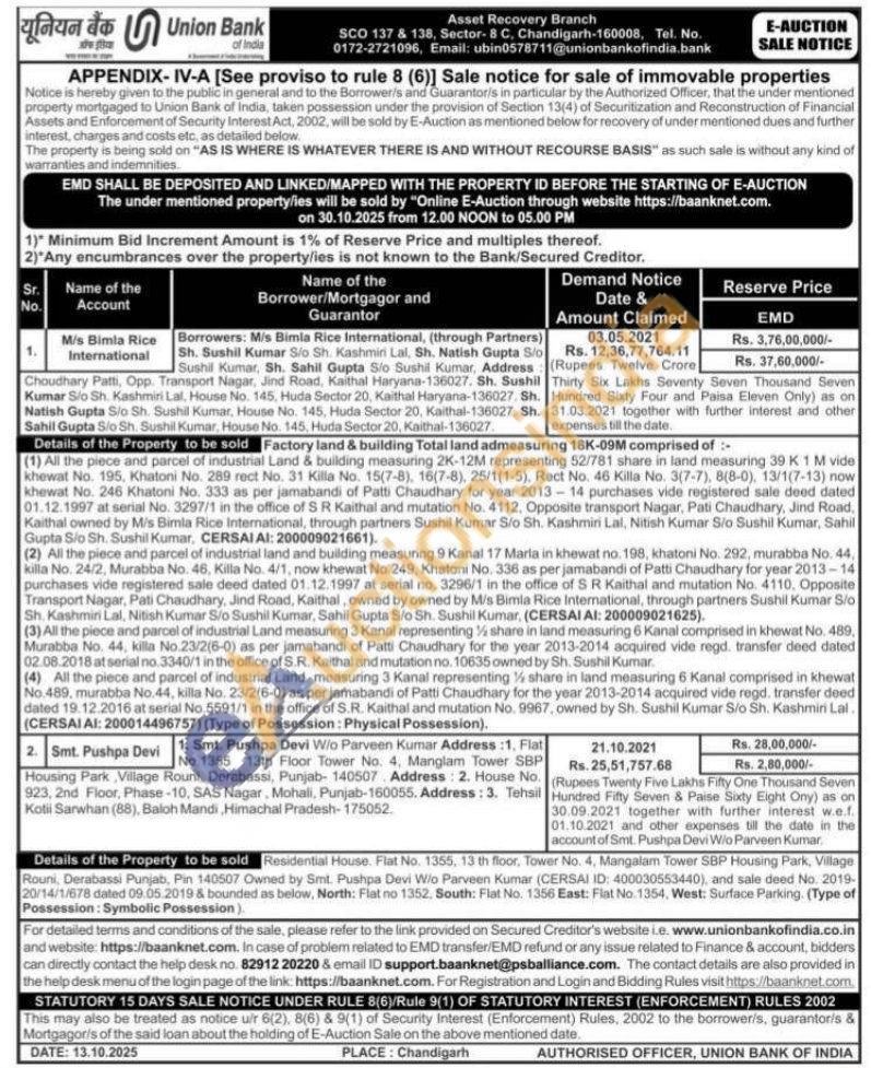 Residential House. Flat No. 1355, 13 th floor, Tower No. 4, Mangalam Tower SBP Housing Park, Village Rouni, Derabassi Punjab, Pin 140507 Owned by Smt. Pushpa Devi Wio Parveen Kumar (CERSAI ID: 400030553440), and sale deed No. 2019-20/14/1/678 dated 09.05.2019 & bounded as below, North: Flat no 1352, South: Flat No. 1356 East: Fiat No. 1354, West: Surface Parking