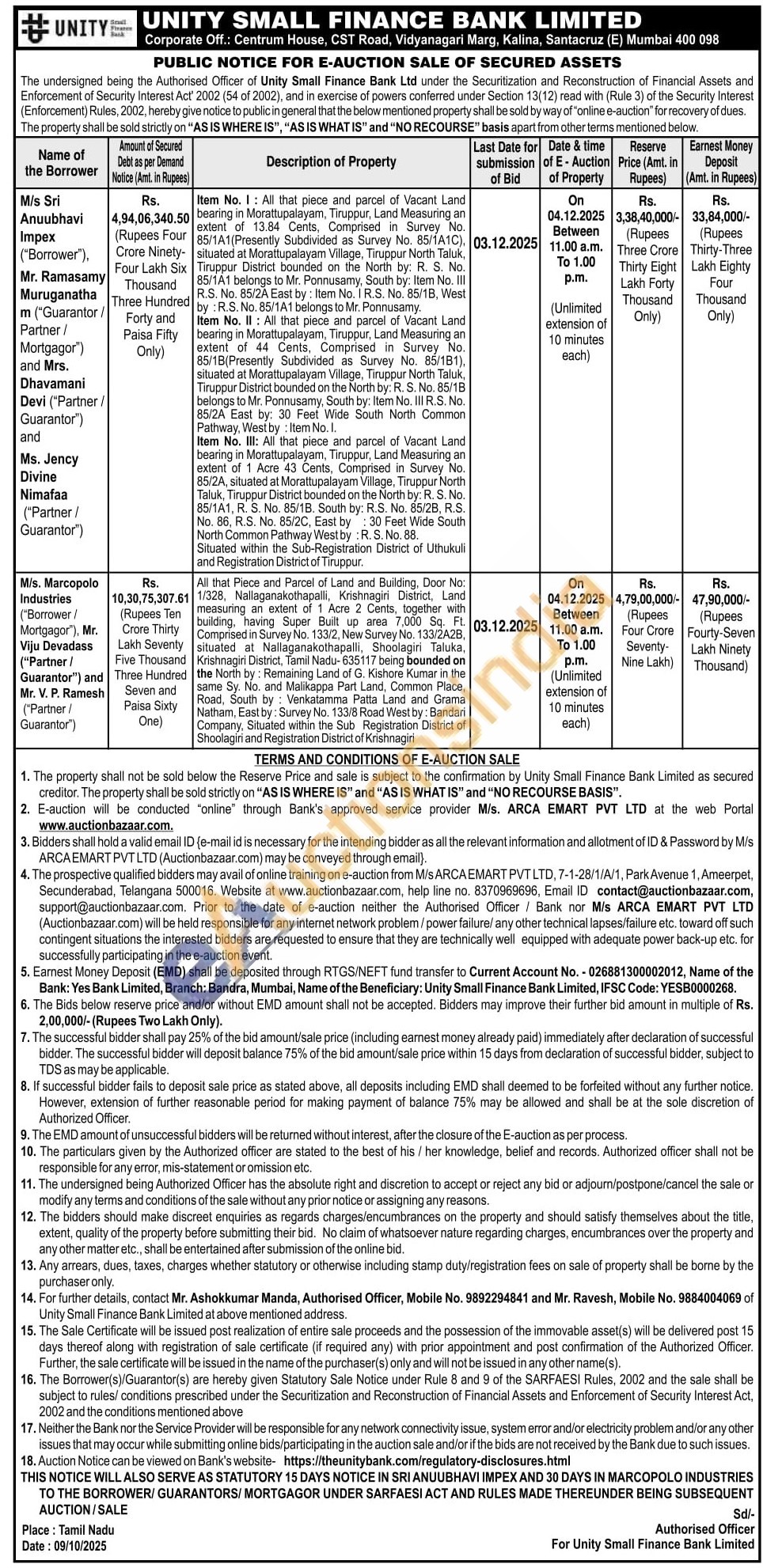 Mr. Ashokkumar Manda Authorised Officer Mobile No : 9892294841 / Mr. Ravesh, Mobile No : 9884004069