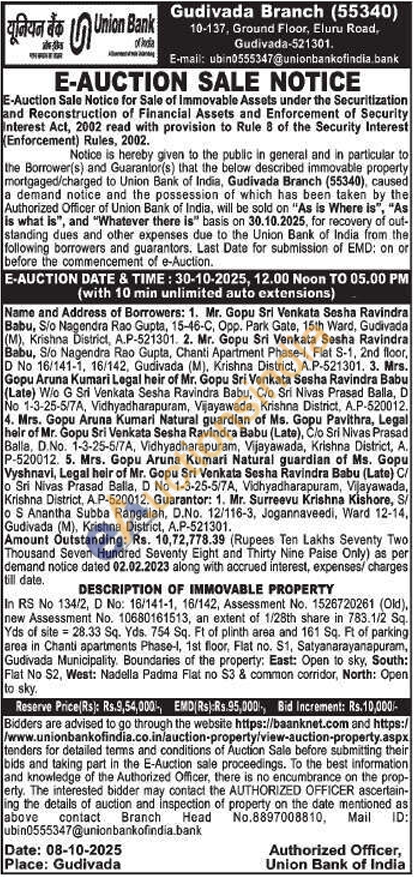 In RS No 134/2, D No: 16/141-1, 16/142, Assessment No. 1526720261 (Old), new Assessment No. 10680161513, an extent of 1/28th share in 783.1/2 Sq. Yds of site 28.33 Sq. Yds. 754 Sq. Ft of plinth area and 161 Sq. Ft of parking area in Chanti apartments Phase-I, 1st floor, Flat no. S1, Satyanarayanapuram, Gudivada Municipality. Boundaries of the property: East: Open to sky, South: Flat No S2, West: Nadella Padma Flat no $3 & common corridor, North: Open to sky.