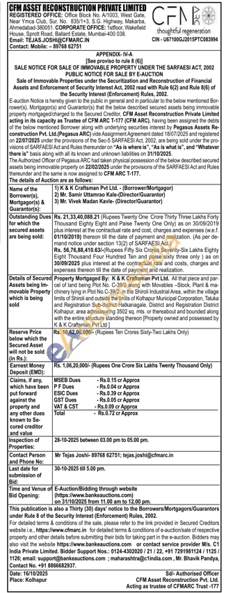 Property Mortgaged By: K & K Craftsman Pvt Ltd. All that piece and par-cel of land being Plot No. C-39/2 along with Movables -Stock, Plant & ma chinery lying in Plot No. C-39/2, in the Shiroli industrial Area, within the village limits of Shiroli and outside the limits of Kolhapur Municipal Corporation, Taluka and Registration Sub-district Hatkanagale, District and Registration District Kolhapur, area admeasuring 3502 sq. mts. or thereabout and bounded along with the entire structure standing thereon (Property owned and possessed by K&K Craftsman Pvt Ltd]