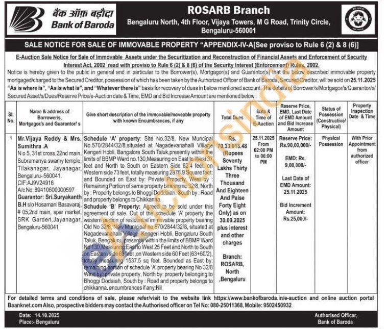 contact the Authorised officer on Tel No: 080-25011368, Mobile: 9502450932