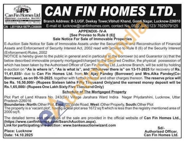 Plot Part of Land Khasra No. 243(SA) Village Jarahara Ward Indira Nagar Priydarshini, Lucknow, Uttar Pradesh-226016 Boundaries-:North: Other Plot, East: 20'Wide Road, West: Other Property, South: Other Plot The property is a 'vacant plot, having actual plot area 1672 sq ft which is less than the registry mentioned area of 2000 sq ft.