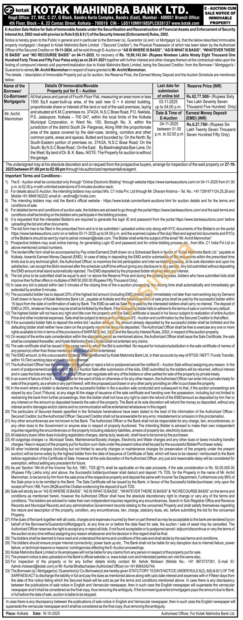 Contact Mr. Kuntal Bhattacharjee (Authorized Officer) on +91 9064242744.