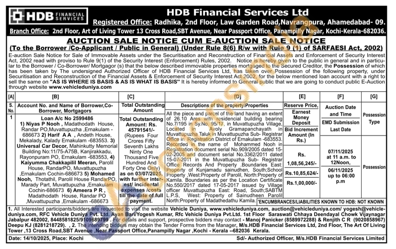 All the piece and parcel of the land having an extent of 26.10 Ares with residencial building bearing No.7/195 in Sy.No. 95/17, in Muvattupuzha Village. Located in Avoly Gramapanchayath in Muvattupuzha Taluk in Muvattupuzha Sub-Registrar Office in Registration District of Ernakulam -683553. Recorded in the name of Mohammed Nooh in Registration document serial No.909/2005 dated 15-02-2005 and document serial No.3362/2011 dated 15-07-2011 in the Muvattupuzha Sub- Registrar Office Records And Property Boundaries East: Property of Kunjamadu sainudhen, South School Property West: Property of Parolil, North: Property of Kamila. Boundaries as per the Location Certificate No.550/2017 dated 17-05-2017 issued by Village officer Muvattupuzha East: Road, South: SABTM L.P.S. West: Property of Sainudheen Parolil North:Property of Madathedathu Kamila.