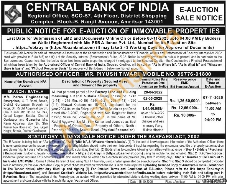 All that part and parcel of the Factory Land and Building measuring 6 Kanal 5 Marla bearing Khasra no. 1243 (2-14) -1245 Min, (0-15) -1244 (0-2)-1259 (1-13)-1260 (1-1), Khewat Khatauni no. 154/204, Jamabandi for the year 2003-04 wakia Faizpur 213, Tehsil Batala as per Deed dated 08-10-2007, Registered with Sub Registrar Batala having Vakia no. 2954, Bahi no. 1, in the name of Mr. Rachit Aggarwal S/o Mr. Shiv Kumar and bounded as East Property of Others, West: Property of Others, North: Property of Others, South: Road. (Physical Possession)