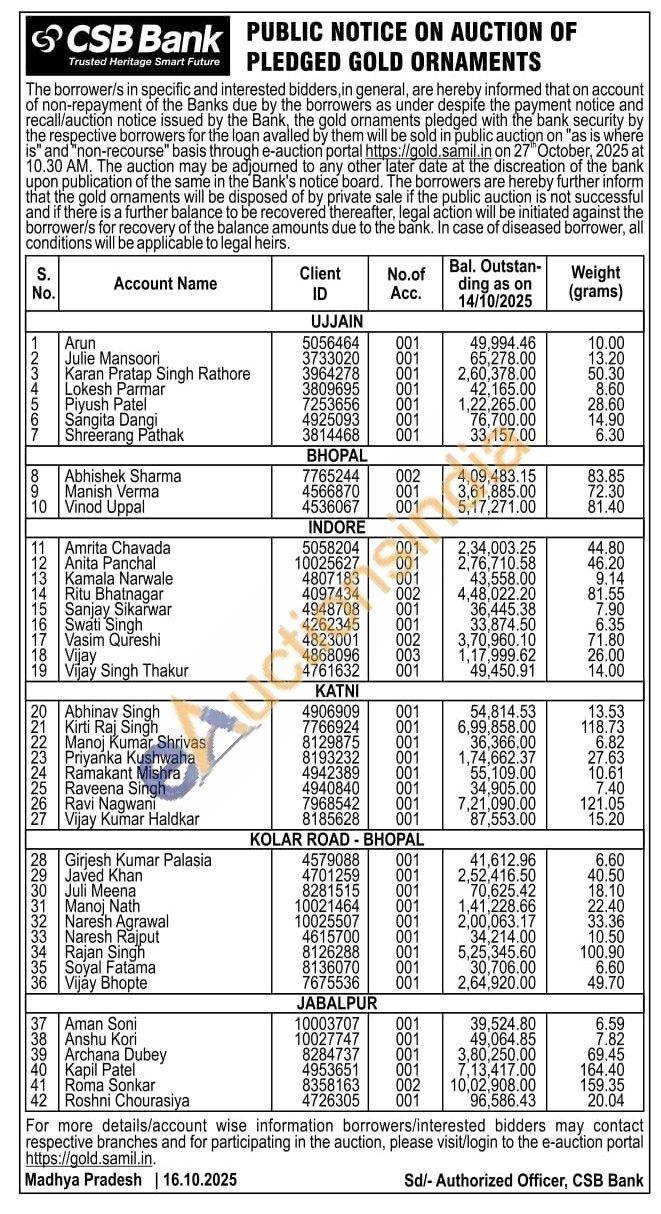 CSB Bank Gold Auctions Auction in Ujjain