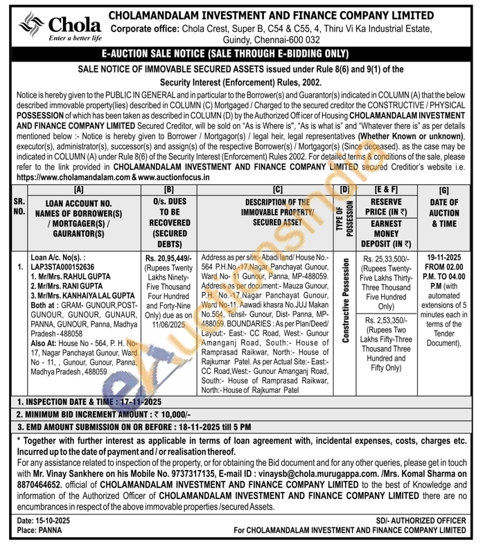 Contact Mr. Vinay Sankhere on his Mobile No. 9737317135, E-mail ID: vinaysb@chola.murugappa.com. /Mrs. Komal Sharma on 8870464652