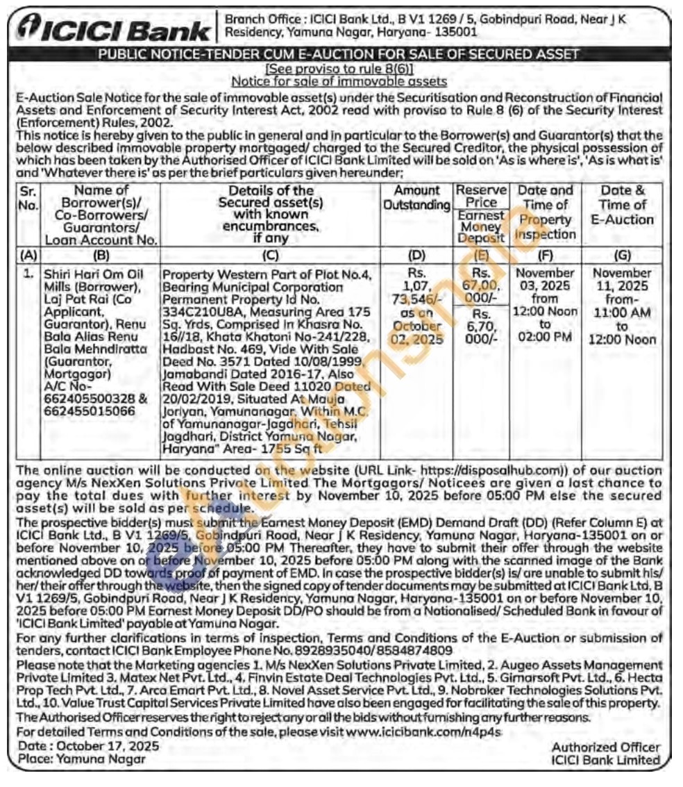 Property Western Part of Plot No.4, Bearing Municipal Corporation Permanent Property Id No. 334C210U8A, Measuring Area 175 Sq. Yrds, Comprised in Khasra No. 16//18, Khata Khatoni No-241/228, Hadbast No. 469, Vide With Sale Deed No. 3571 Dated 10/08/1999, Jamabandi Dated 2016-17. Also 20/02/2019, Situated At Mauja Read With Sale Deed 11020 Dated Joriyan, Yamunanagar, Within M.C. of Yamunanagar-Jagdhari, Tehsil Jagdhari, District Yomuna Nagar, Haryana" Area- 1755 Sq ft