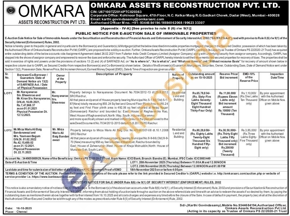 Property belongs to Mirza Waris Ali Baig Doc No.4709/2007-08 dt. 10.1.2008 SRO Raichur : All that piece and parcel of house property bearing Municipal No.9-9-66(Old)9-9-70 (New) measuring 958 sq. feet situated at Maddipet, Raichurbounded by East: House of Zaheeruddin, West: House of Khaja Moinuddin, North: House of Munawar Sab, South:Lane
