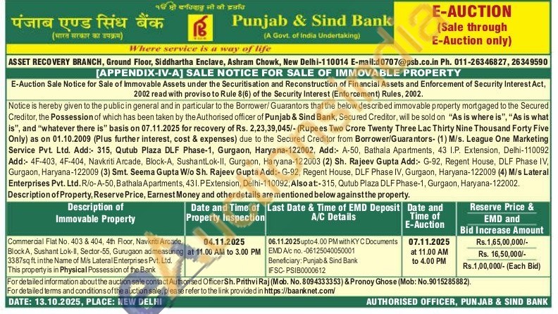 Commercial Flat No. 403 & 404, 4th Floor, Navkriti Arcade, Block A, Sushant Lok-II, Sector-55, Gurugaon admeasuring 3387sq ft. inthe Name of Mis Lateral Enterprises Pvt. Ltd. This property is in Physical Possession of the Bank