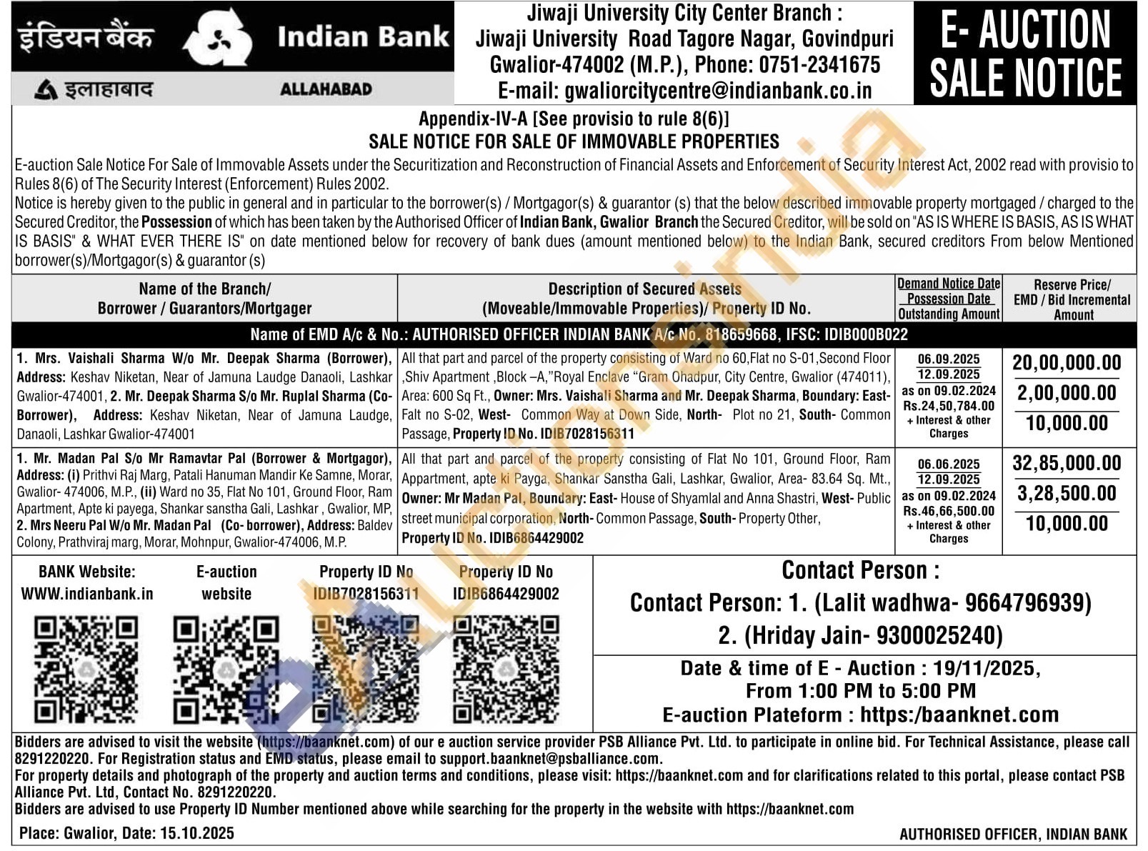 All that part and parcel of the property consisting of Flat No 101, Ground Floor, Ram Appartment, apte ki Payga, Shankar Sanstha Gali, Lashkar, Gwalior, Area- 83.64 Sq. Mt., Owner: Mr Madan Pal, Boundary: East-House of Shyamlal and Anna Shastri, West-Public street municipal corporation, North-Common Passage, South-Property Other,