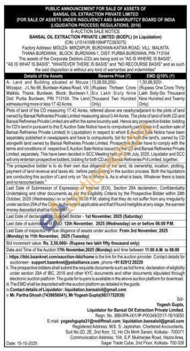 A Land and Building situated at Mouza Mirzapur, JL No 66, Burdwan-Katwa Road, VR Malkita, Thana, Burdwan, Block: Burdwan-1, Dist. Purta Burdwan, PIN 713104. The Land admeasuring more or less 17.42 Acres