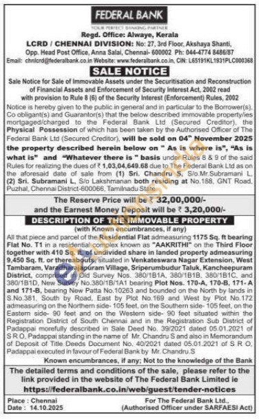All that piece and parcel of the Residential Flat admeasuring 1175 Sq. ft bearing Flat No. T1 in a residential complex known as "AAKRITHI" on the Third Floor together with 410 Sq. ft. of undivided share in landed property admeasuring 9,450 Sq. ft. or thereabouts, situated in Venkateswara Nagar Extension, West Tambaram, Varadharajapuram Village, Sriperumbudur Taluk, Kancheepuram District, comprised in Old Survey Nos. 380/181A, 380/1818. 380/1B1C, and 380/181D, New Survey No.380/18/1A1 bearing Plot Nos. 170-A, 170-8, 171-A and 171-B, bearing New Patta No. 10263 and bounded on the North by lands in S.No.381, South by Road, East by Plot No. 169 and West by Plot No. 172 admeasuring on the Northen side-105 feet, on the Southern side-105 feet, on the Eastern side- 90 feet and on the Western side- 90 feet situated within the Registration District of South Chennai and in the Registration Sub District of Padappal morefully described in Sale Deed No. 39/2021 dated 05.01.2021 of SRO. Padappal standing in the name of Mr. Chandru S and also in Memorandum of Deposit of Title Deeds Document No. 40/2021 dated 05.01.2021 of SRO Padappal executed in favour of Federal Bank by Mr. Chandru S