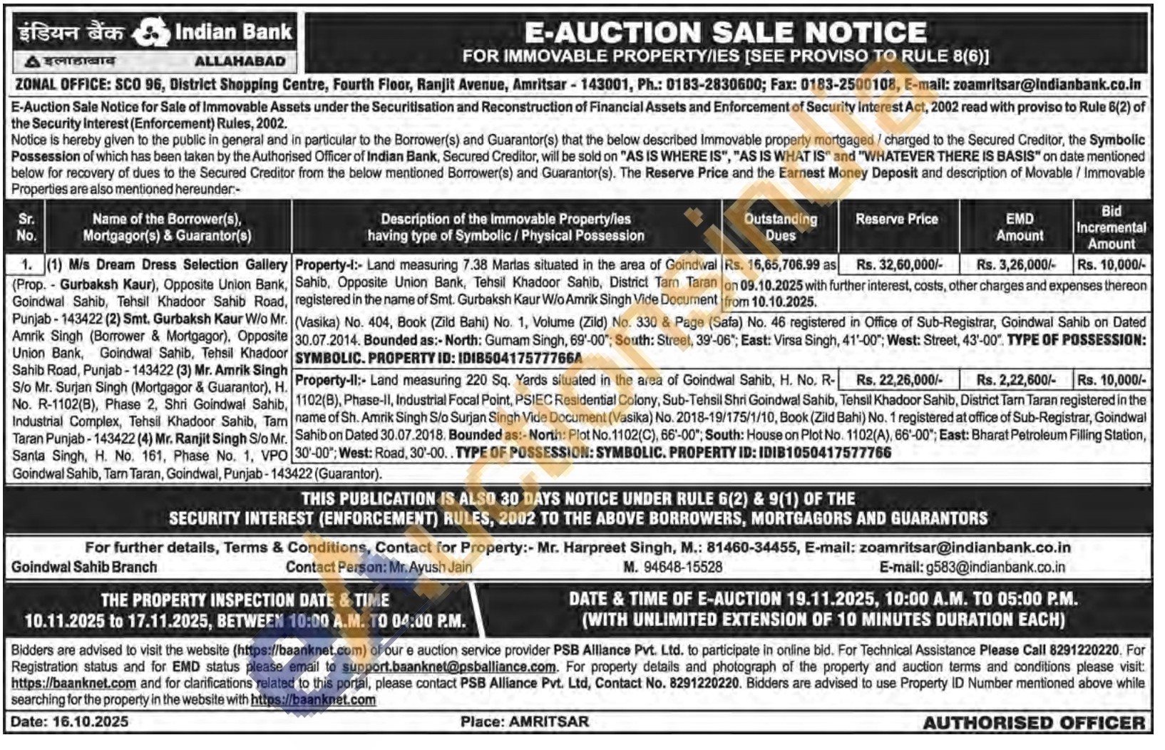 1) Property-1:- Land measuring 7.38 Marlas situated in the area of Goindwal Sahib, Opposite Union Bank, Tehsil Khadoor Sahib, District Tam Taran registered in the name of Smt. Gurbaksh Kaur W/o Amrik Singh Vide Document Vasika) No. 404, Book (Zild Bahi) No. 1, Volume (Zild) No. 330 & Page (Safa) No. 46 registered in Office of Sub-Registrar, Goindwal Sahib on Dated 30.07.2014. Bounded as:- North: Gumam Singh, 69-00"; South: Street, 39-06"; East: Virsa Singh, 41'-00"; West: Street, 43'-00". TYPE OF POSSESSION: SYMBOLIC. PROPERTY ID: IDIB50417577766A