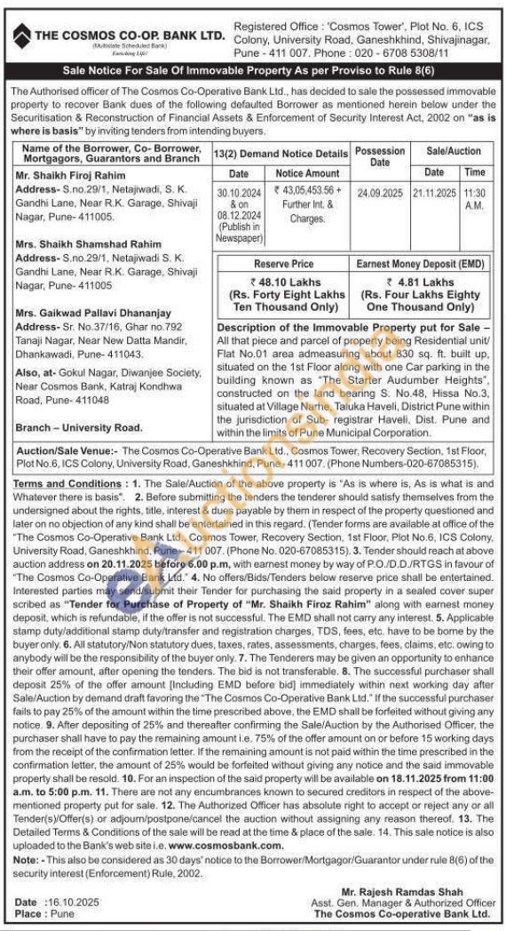 All that piece and parcel of property being Residential unit/Flat No.01 area admeasuring about 830 sq. ft. built up, situated on the 1st Floor along with one Car parking in the building known as "The Starter Audumber Heights". constructed on the land bearing S. No.48, Hissa No.3, situated at Village Narhe, Taluka Haveli, District Pune within the jurisdiction of Sub- registrar Haveli, Dist. Pune and within the limits of Pune Municipal Corporation.