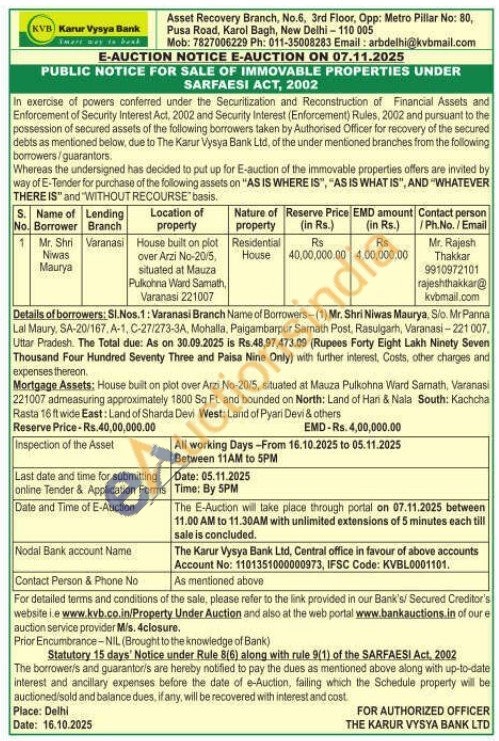 Sl.Nos. 1: Varanasi Branch Name of Borrowers-(1) Mr. Shri Niwas Maurya, Sio. Mr Panna Lal Maury, SA-20/167, A-1, C-27/273-3A, Mohalla, Paigambarpur Sarnath Post, Rasulgarh, Varanasi-221007. Uttar Pradesh. The Total due: As on 30.09.2025 is Rs.48,97,473.09 (Rupees Forty Eight Lakh Ninety Seven Thousand Four Hundred Seventy Three and Paisa Nine Only) with further interest, Costs, other charges and expenses thereon. Mortgage Assets; House built on plot over Arzi No-20/5, situated at Mauza Pulkohna Ward Samath, Varanasi 221007 admeasuring approximately 1800 Sq Ft. and bounded on North: Land of Hari & Nala South: Kachcha Rasta 16 ft wide East: Land of Sharda Devi West: Land of Pyari Devi & others
