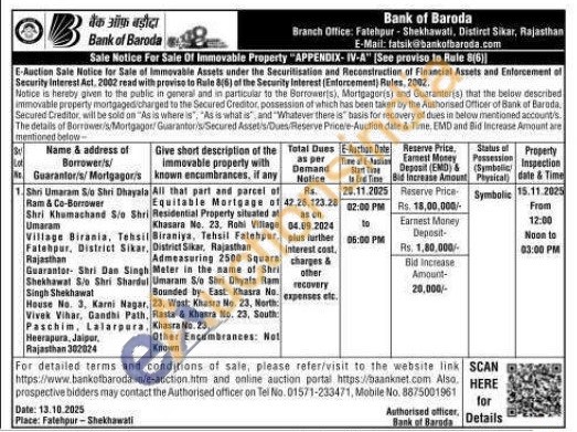 All that part and parcel of Equitable Mortgage of Residential Property situated at Khasara No. 23. Rohi Village Biraniya, Tehsil Fatehpur, , District Sikar, Rajasthan Admeasuring 2500 Square Meter in the name of Shri Umaram S/o Shri Dhyala Ram Sounded by- East: Khatra No. , 23, West: Khasra No. 23, North: , Rasta & Khasra No. 23, South , Khasra No. 23. Other Encumbrances: Not Known