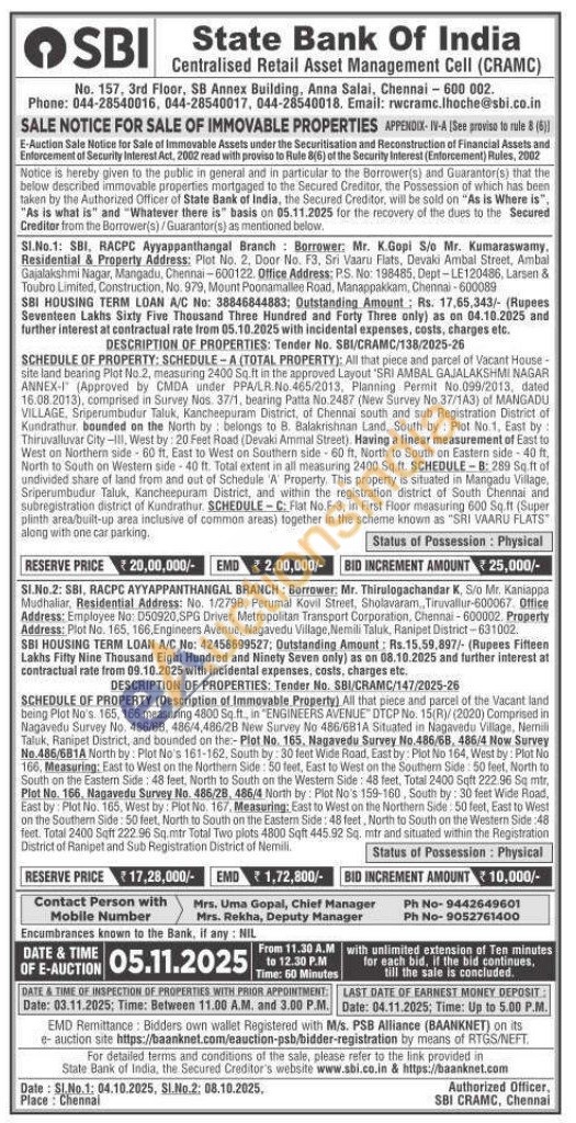 SCHEDULE OF PROPERTY: SCHEDULE-A (TOTAL PROPERTY): All that piece and parcel of Vacant House-site land bearing Plot No.2, measuring 2400 Sq.ft in the approved Layout 'SRI AMBAL GAJALAKSHMI NAGAR ANNEX-I (Approved by CMDA under PPA/LR.No.465/2013, Planning Permit No.099/2013, dated 16.08.2013), comprised in Survey Nos. 37/1, bearing Patta No.2487 (New Survey No.37/143) of MANGADU VILLAGE, Sriperumbudur Taluk, Kancheepuram District, of Chennai south and sub Registration District of Kundrathur, bounded on the North by belongs to B. Balakrishnan Land, South by Plot No.1, East by: Thiruvalluvar City-III, West by: 20 Feet Road (Devaki Ammal Street). Having a linear measurement of East to West an Northern side 60 ft. East to West on Southern side-60 ft, North to South on Eastern side-40 ft, North to South on Western side-40 ft. Total extent in all measuring 2400 Sq.ft. SCHEDULE-B: 289 Sq.ft of undivided share of land from and out of Schedule 'A' Property. This property is situated in Mangadu Village, Sriperumbudur Taluk, Kancheepuram District, and within the registration district of South Chennai and subregistration district of Kundrathur SCHEDULE-C: Flat No.F-3, in First Floor measuring 600 Sq.ft (Super plinth area/built-up area inclusive of common areas) together in the scheme known as "SRI VAARU FLATS along with one car parking.