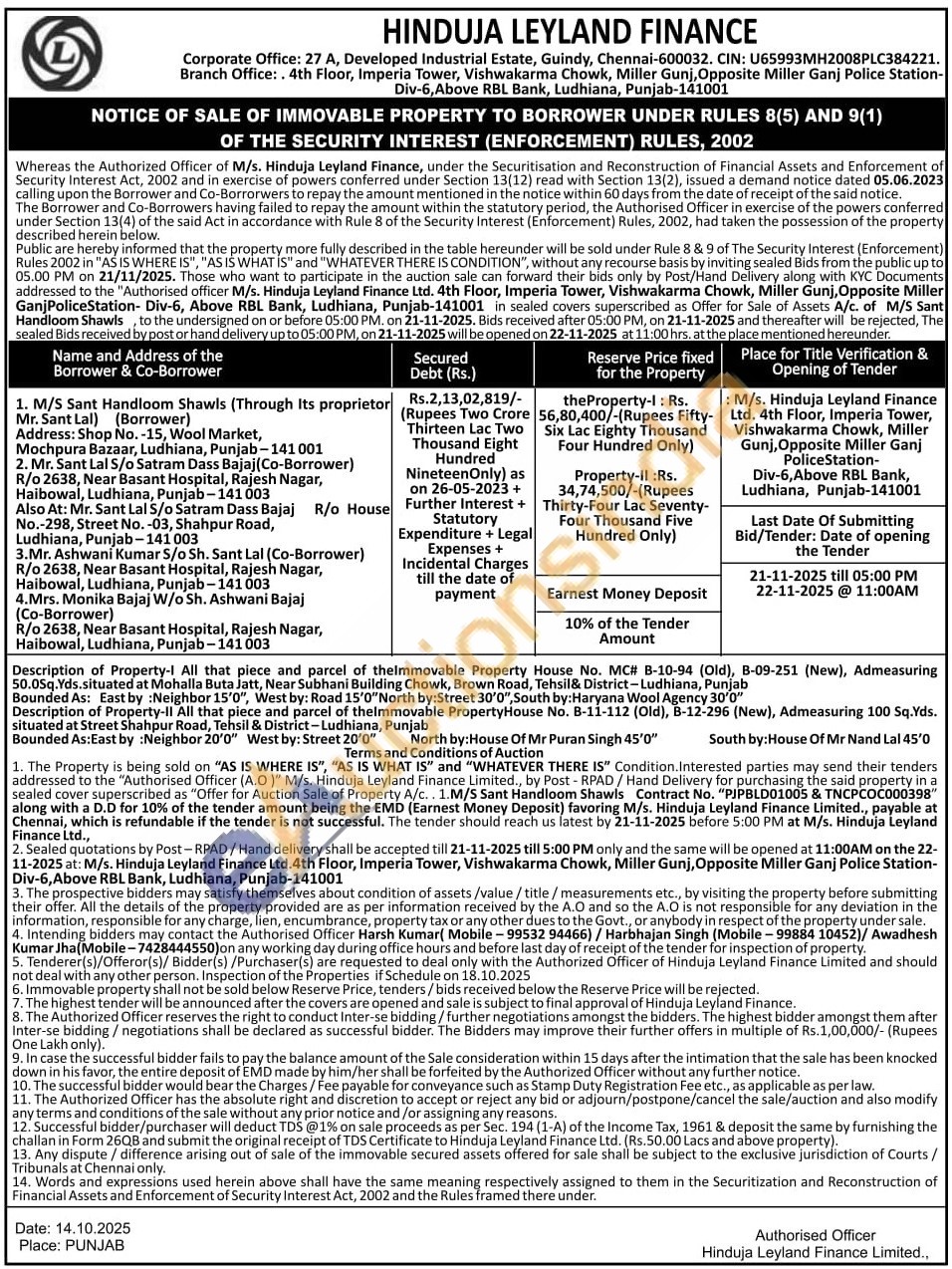 Authorised Officer Harsh Kumar(Mobile No : 9953294466) / Harbhajan Singh (Mobile No : 9988410452) / Awadhesh Kumar Jha (Mobile No : 7428444550)