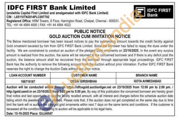 IDFC First Bank Ltd Gold Auctions Auction in Chennai