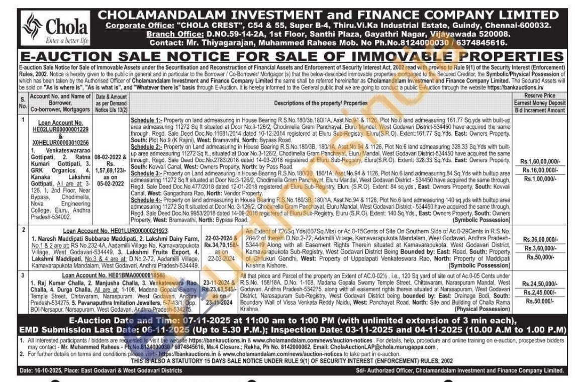 Schedule 1:- Property on land admeasuring in House Bearing R.S.No. 180/3b, 180/1A, Asst. No.94 & 1126, Plot No.6 land admeasuring 161.77 Sq yds with built-up area admeasuring 11272 Sq ft situated at Door No:3-126/2, Chodimella Gram Panchayat, Eluru Mandal, West Godavari District-534450 have acquired the same through, Regd. Sale Deed Doc. No. 11681/2014 dated 10-12-2014 registered at Eluru Sub-Registry, Eluru(S.R.O). Extent: 161.77 Sq. Yds. East: Owners Property. South: Plot No.9 (K Rajini), West: Bramavathi, North: Bypass Road. Schedule 2: Property on Land admeasuring in House Bearing R.S.No. 180/38, 180/1A, Asst. No.94 & 1126, Plot No.6 land admeasuring 328.33 Sq. Yds with built-up area admeasuring 11272 Sq ft., situated at Door No.3-128/2, Chodimella Gram Panchayat, Eluru Mandal, West Godavar District-534450 have acquired the same through, Regd. Sale Deed Doc. No.2783/2018 dated 14-03-2018 registered at Eluru Sub-Registry, Eluru(S.R.O). Extent: 328.33 Sq. Yds. East: Owners Property. South: Kovvali Canal, West: Owners Property, North: by Pass Road Schedule 3:- Property on Land admeasuring in House Bearing R.S.No. 180/38, 180/1A, Asst.No.94 & 1126, Plot No.6 land admeasuring 84 Sq. Yds with builtup area admeasuring 11272 Sq it situated at Door No:3-126/2, Chodimella Gram Panchayat, Eluru Mandal, West Godavari District-534450 have acquired the same through, Regd. Sale Deed Doc No.477/2018 dated 12-01-2018 registered at Eluru Sub-Registry, Eluru (S.R.O). Extent: 84 sq yds., East: Owners Property, South: Kovvali Canal, West: Gangadhara Rao, North: Vendor Property Schedule 4:- Property on land admeasuring in House Bearing R.S.No. 180/38, 180/1A, Asst. No.94 & 1126, Plot No. 6 land admeasuring 140 sq yds with builtup area admeasuring 11272 Sq ft situated at Door No: 3-126/2, Chodimella Gram Panchayat, Eluru Mandal, West Godavari District-534450 have acquired the same through, Regd. Sale Deed Doc No.9953/2018 dated 14-09-2018 registered at Eluru Sub-Registry. Eluru (SR.O). Extent: 140 Sq. Yds., East: Owners Property, South: Owners Property, West: Bramavathi, North: Bypass Road