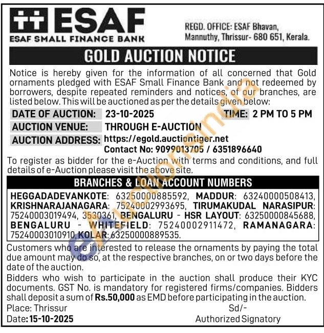 ESAF SMALL FINANCE BANK Gold Auctions Auction in Mysuru